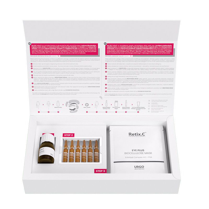 Retix.C All Eye Therapy to kompleksowy zabieg obejmujący trzy uzupełniające się etapy, które zapewniają intensywną regenerację i widoczne odmłodzenie skóry wokół oczu:
