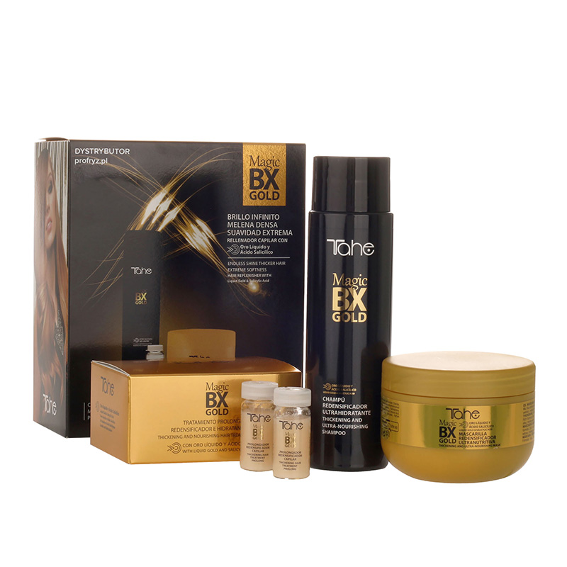 Zestaw Szampon + Maska + 5 x ampułka Maintenance TreatmentTahe Magic BX Gold Zestaw to zaawansowana kuracja regenerująca do włosów, opracowana na bazie biotechnologicznego botoxu kapilarnego oraz płynnego złota. Intensywnie odbudowuje uszkodzone włókna, przywraca elastyczność i blask, jednocześnie chroniąc przed puszeniem i utratą wilgoci. Idealny dla włosów suchych, osłabionych, po zabiegach chemicznych oraz stylizacji termicznej.